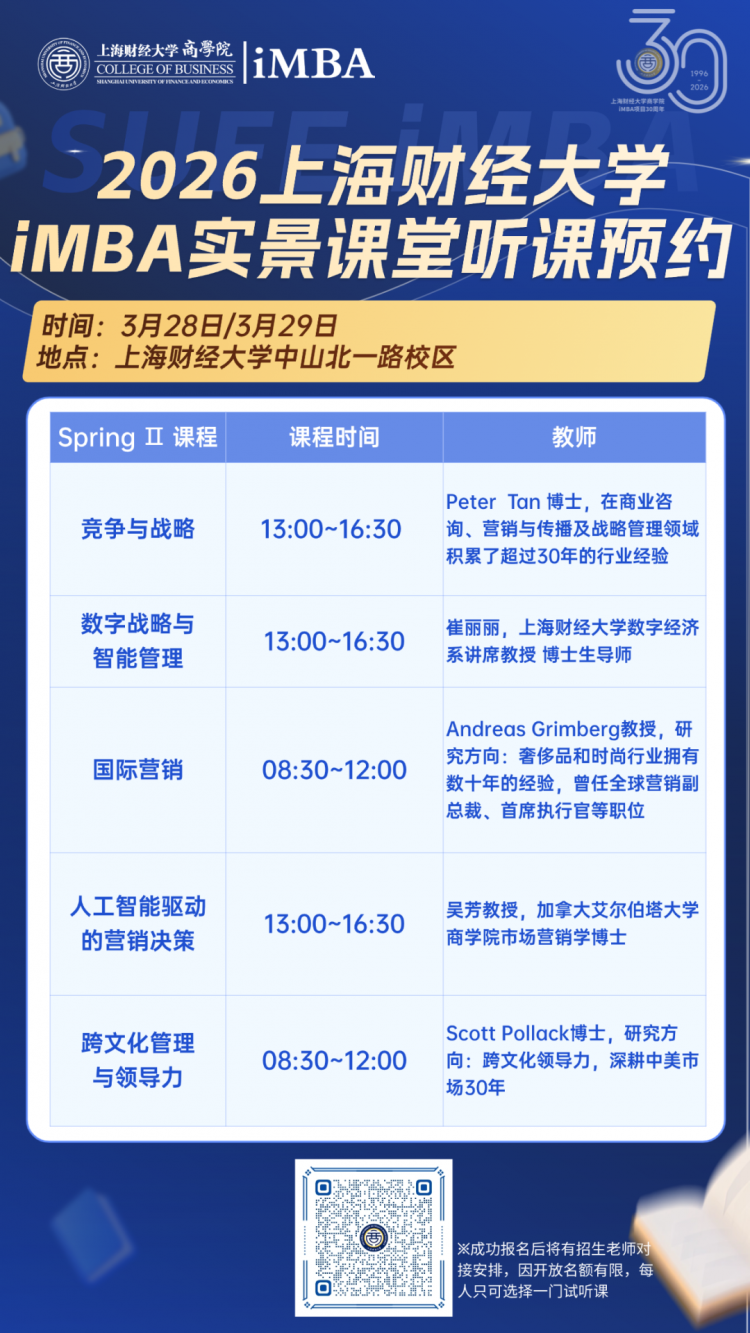 新聞 MBA 03-20 17:47三十華誕 智啟新程|上財(cái)iMBA項(xiàng)目SpringⅡ?qū)嵕罢n堂聽課預(yù)約(3/28-3/29)
